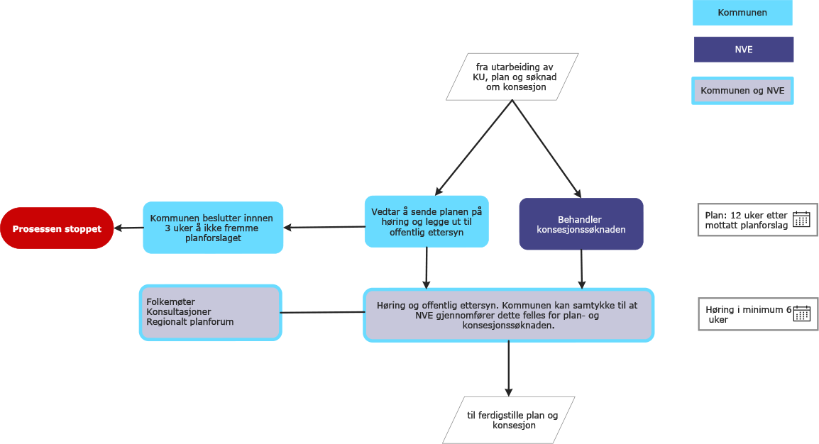 Kommunen og NVE skal samordne arbeidet med å avgjøre om planforslaget og konsesjonssøknaden skal sendes på høring og legges ut til offentlig ettersyn i minimum 6 uker. Dersom planforslaget eller konsesjonssøknaden er mangelfull, kan henholdsvis kommunen og NVE be om oppdatert planforslag eller konsesjonssøknad før de behandler saken. I kap. 11.9 og 12.3 er reglene for høring og offentlig ettersyn beskrevet nærmere.
