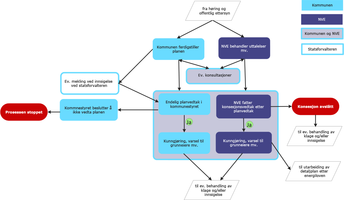 Etter at høringsfristen er utløpt, skal høringsuttalelser og merknader fra offentlig ettersyn sendes til tiltakshaver for deres kommentarer. Kommunen skal på vanlig måte gjennomgå høringsuttalelser og merknader før planforslaget legges fram for kommunestyret til endelig behandling. Tilsvarende skal NVE gjennomgå høringsuttalelser og merknader til konsesjonssøknaden. Ofte vil det i tillegg være behov for befaring i forkant av konsesjonsavgjørelsen. Det forutsettes dialog mellom kommunen og NVE i denne fasen. Dersom det gjøres endringer i områdereguleringen eller konsesjonen, skal det gjøres en konkret vurdering av om endringene vil utløse konsultasjonsplikt med berørte samiske interesser, jf. kap. 13.