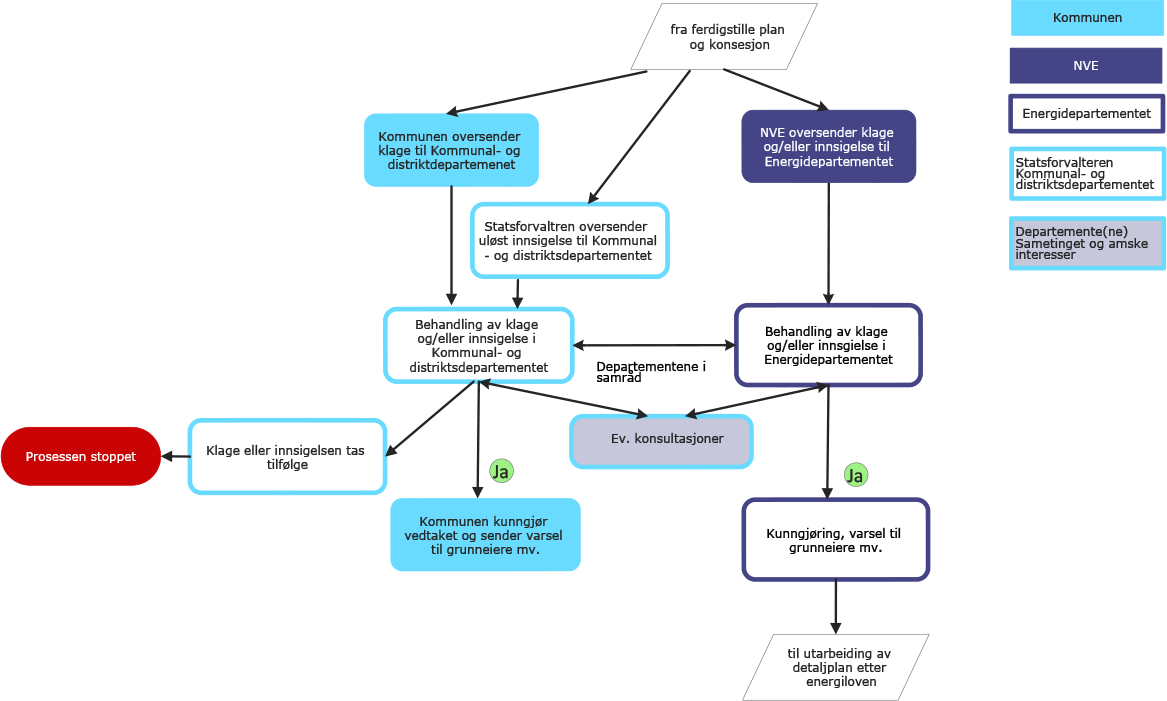 Reglene om innsigelser i energiloven følger reglene i plan- og bygningsloven så langt de passer. Dersom NVE mottar innsigelse til søknad om konsesjon, søker NVE gjennom dialog med innsigelsesmyndigheten og tiltakshaver å løse saken. Statsforvalteren gjennomfører ikke mekling, slik det er i plansaker. Dersom NVE ikke finner å kunne imøtekomme innsigelsen, kan NVE likevel fatte vedtak om å gi konsesjon til tiltaket, men konsesjonsvedtaket blir ikke endelig. NVE oversender saken til Energidepartementet for endelig avgjørelse.