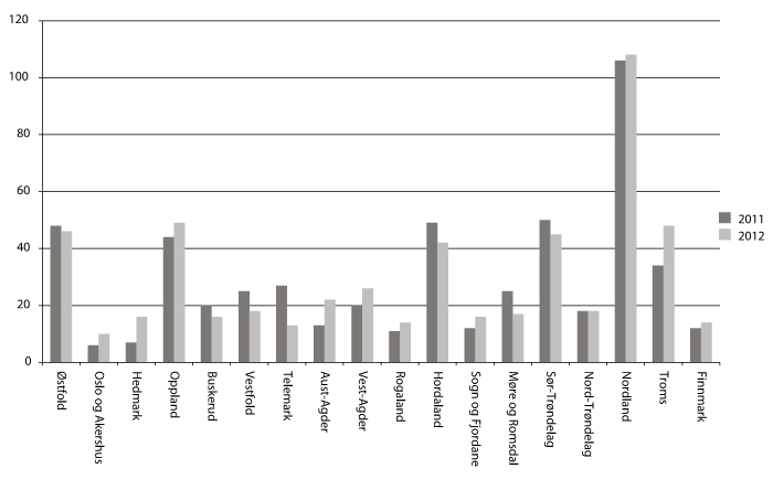Antall fornyingsprosjekter per fylkesmannsembete varierer betydelig i 2012. Dette har en naturlig sammenheng med antall kommuner i fylket, men det er også stor variasjon mellom fylkene i størrelsen på skjønnsrammen, og hvor stor del av skjønnsrammen som settes av til fornyingsprosjekter. Figur 4.1 viser fordelingen av antall prosjekter i 2011 og 2012. Nordland fordeler klart mest skjønnsmidler til fornyingsprosjekter, 38,3 mill. kroner på 107 prosjekter. Fylkesmannen i Troms har med en økning på 14 prosjekter støttet betydelig flere prosjekter i 2012 enn i 2011, mens fylkesmannen i Telemark har hatt størst nedgang i antall prosjekter, med 14 færre prosjekter. Embetene fordeler fornyingsmidlene etter søknader fra kommunene, og de fleste embetene har en åpen prosess om hvilke kriterier som vektlegges ved fordelingen.