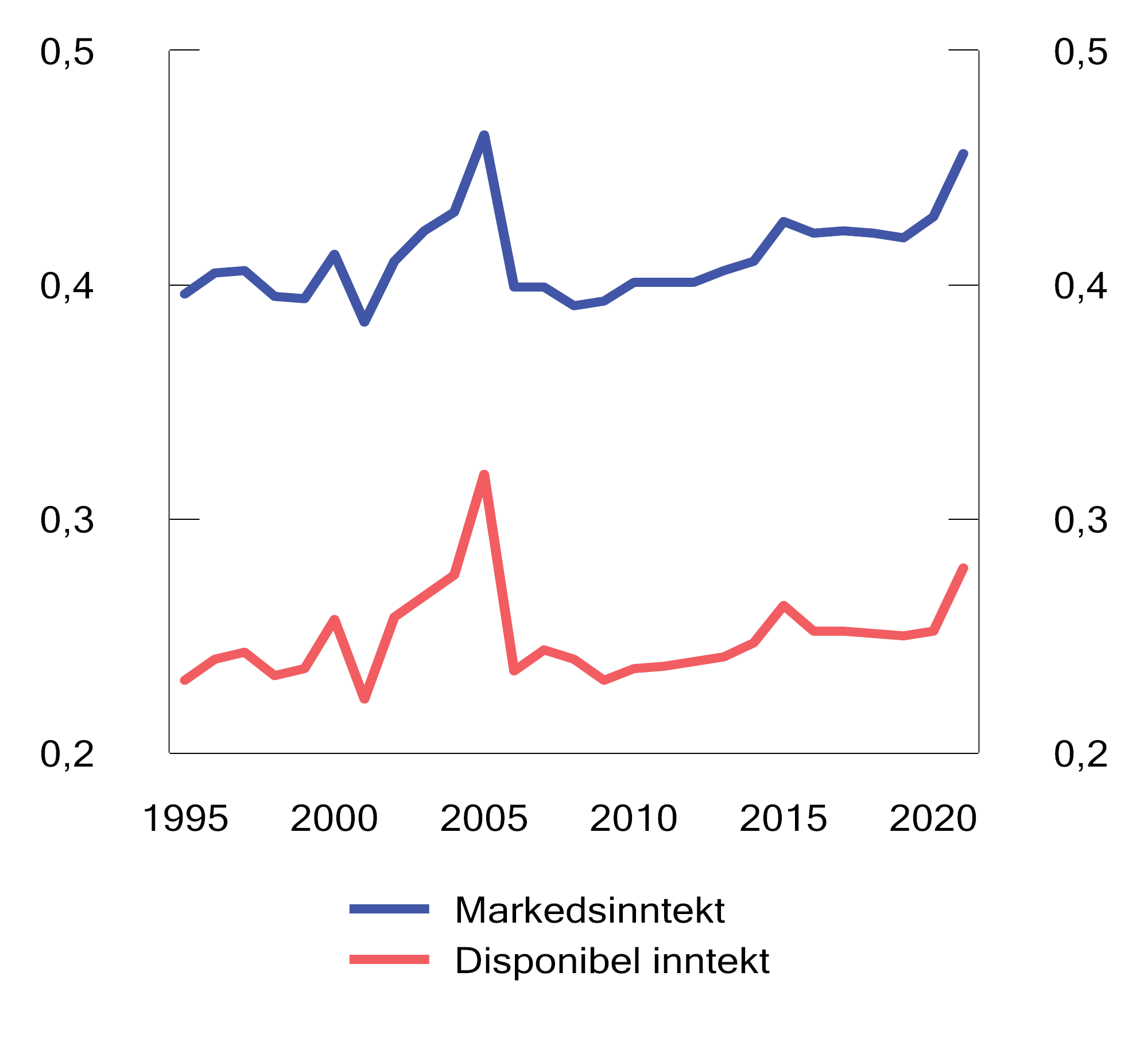 Figur 2.21 Gini-koeffisient for markedsinntekter og disponibel inntekt.1 Prosent. Ekvivalent inntekt (EU-skala). 1995–2021