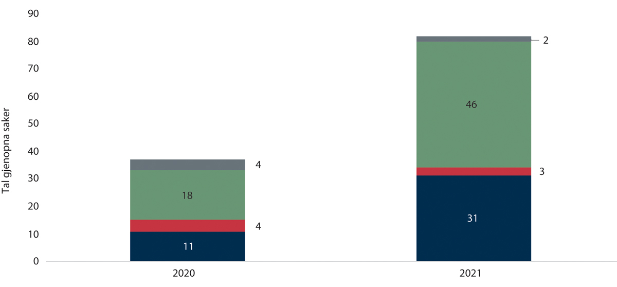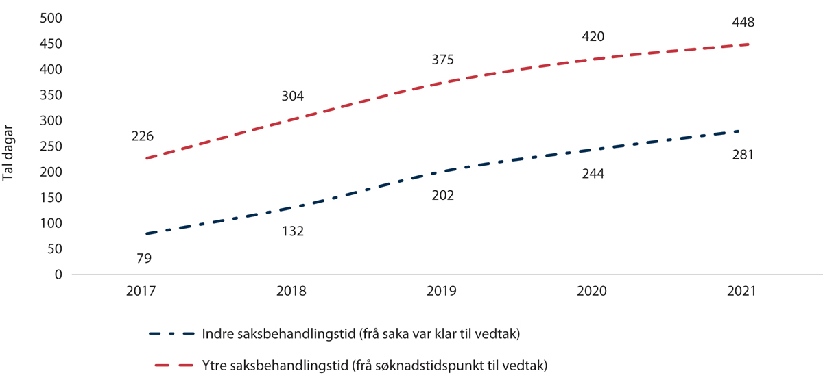 Gjennomsnittleg saksbehandlingstid for alle saker auka frå 2020 til 2021 og var i 2021 på 168 dagar. Auka saksbehandlingstid heng bl.a. saman med talet på innkomne saker, samansetninga av porteføljen, covid-19-pandemien og endringar i verksemda.