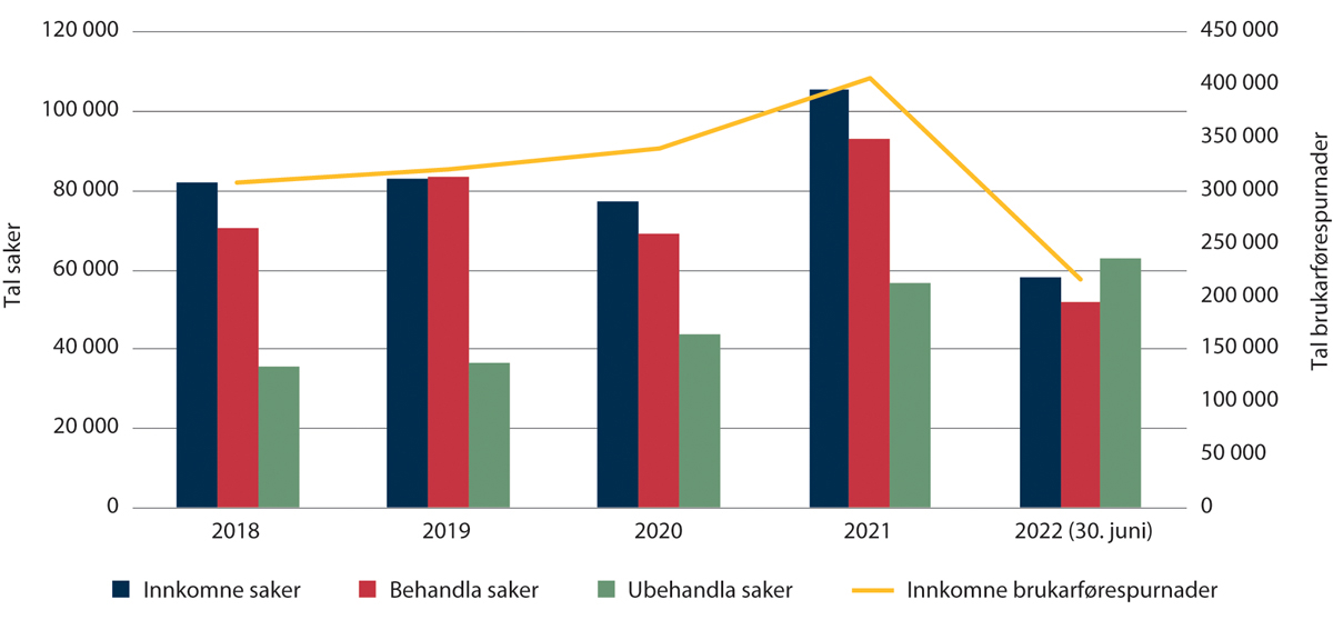 UNE behandla til saman 4 700 saker i 2021, som var nesten 600 færre enn i 2020. Sekretariatet er styrkt i siste halvdel av 2021 og første halvdel av 2022, og det er forventa ein auke i talet på behandla saker i 2022 samanlikna med 2020 og 2021.
