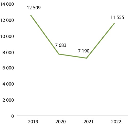 I 2022 mottok ombudet totalt 2 410 forespørsler om veiledning. Det er en liten nedgang på 3 pst. sammenlignet med 2021. Om lag 50 pst. av henvendelsene dreier seg om arbeidsliv. Fordelt på diskrimineringsgrunnlag ligger kjønn (inkludert graviditet og foreldrepermisjon) på topp med 23 pst., tett fulgt av funksjonsnedsettelse 22 pst. og etnisitet 15 pst.