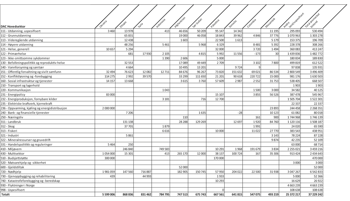 Figur 5.1 Største mottakerland av øremerket bistand1 fordelt på sektorer, 20222 (1 000 kroner)