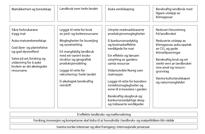 Den viktigaste oppgåva til landbruks- og matsektoren er å sikre innbyggjarane trygge matvarer av god kvalitet og å bidra til ei optimal utnytting av dei jordbaserte naturressursane. Sektoren sysselsette i 2016 om lag 95 000 personar og er av stor verdi for arbeidsplassar og næringsliv over heile landet. Samstundes er det ei næring i utvikling, og dei løysingane som svarte på tidlegare tiders krav og utfordringar er ikkje alltid dei beste i dag. Det er nødvendig med kontinuerleg omstilling for å sikre konkurransekraft i sektoren. Regjeringa har difor sidan ho tiltredde i 2013 gjort fleire tiltak for å styrkje og målrette politikken på området. Regjeringa vil òg framover prioritere slike tiltak.