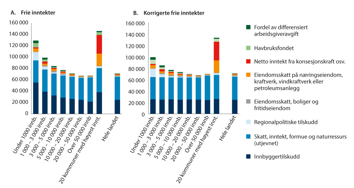 Som vi ser av figur 10.2A, bidrar inntekter fra «annen» eiendomsskatt (eiendomsskatt på næringseiendom, vindkraft- og petroleumsanlegg), netto inntekt fra konsesjonskraft, kraftrettigheter og annen kraft for videresalg, havbruksinntekter og fordel av redusert arbeidsgiveravgift til å løfte inntektene per innbygger i kommunegruppen med de aller høyeste inntektene og kommunegruppen med de minste kommunene vesentlig. Men også uten slike inntekter, det vil si når vi kun ser på inntekter fra rammetilskuddet (innbyggertilskuddet og regionalpolitiske tilskudd) og skatt på inntekt og formue, samt naturressursskatt (som utjevnes i inntektssystemet), har disse kommunene inntekter per innbygger som ligger over landsgjennomsnittet. Dette skyldes blant annet at de minste kommunene gjennomgående har høyere utgiftsbehov enn landsgjennomsnittet, og blir tilført ekstra midler via utgiftsutjevningen i rammetilskuddet. Forskjeller i innbyggertilskudd som følge av forskjeller i utgiftsbehov mellom kommunene bidrar til forskjeller i inntektsnivå per innbygger. Gjennom utgiftsutjevningen blir kommuner kompensert for ufrivillige kostnader knyttet til innbyggere i ulike aldersgrupper, sosiale forhold, geografi, smådriftsulemper og lignende. Blant annet har alle kommuner noen faste kostnader som dekkes gjennom basiskriteriet i kostnadsnøkkelen, og utløser et beløp per kommune (basistilskudd). Når dette basistilskuddet deles på et lavt antall innbyggere, blir inntektene per innbygger høye. Disse kommunene mottar også mer i regionalpolitiske tilskudd per innbygger enn landsgjennomsnittet. Grupper med kommuner som har flere enn 5 000 innbyggere har et nivå på frie inntekter per innbygger som ligger nær landsgjennomsnittet.