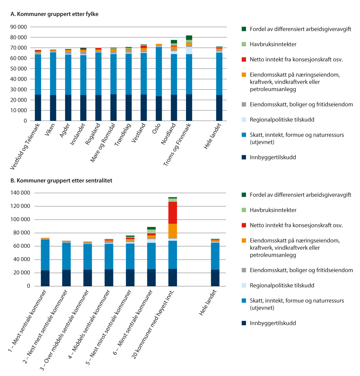 Figur 10.3 viser korrigerte frie inntekter for kommuner gruppert etter henholdsvis fylker og etter sentralitet. Figur 10.3A viser at kommunene i Troms og Finnmark og i Nordland har de høyeste korrigerte frie inntektene i prosent av landsgjennomsnittet. Dette må ses i sammenheng med både nivået på de regionalpolitiske tilskuddene og fordel av redusert arbeidsgiveravgift. Også Oslo som kommune har korrigerte frie inntekter over landsgjennomsnittet. Dette må ses i sammenheng med høye inntekter fra skatt på inntekt og formue.