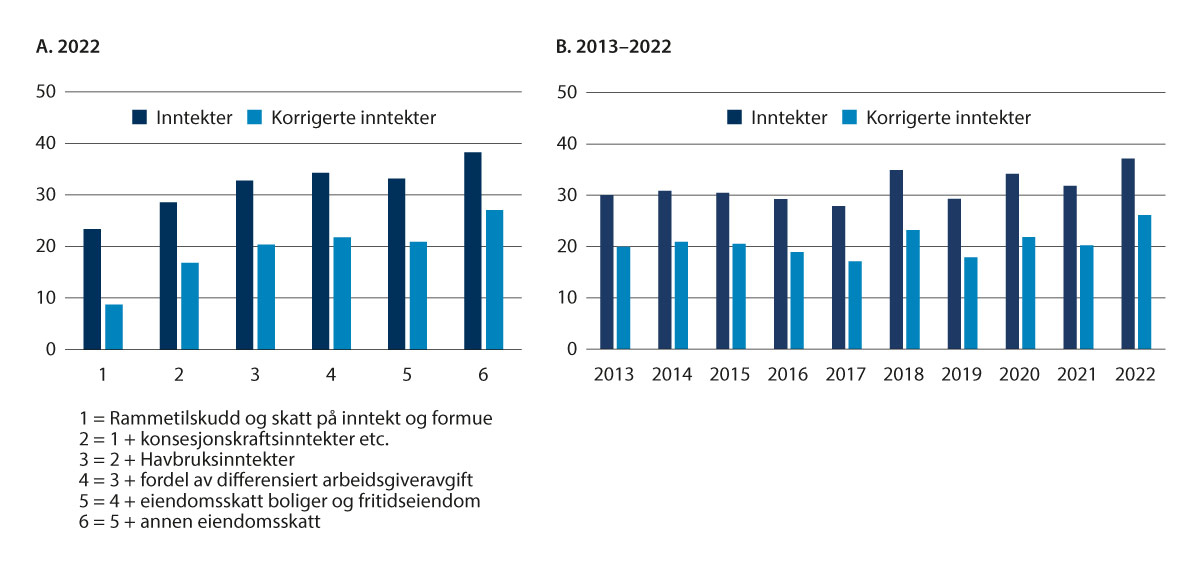 I sammenlikningen av frie inntekter mellom kommunene for 2022 er det derfor korrigert med kostnadsnøkkelen for 2022, det vil si for variasjonen i kostnadene til drift av disse tjenestene. De resterende inntektene blir deretter lagt til i beregningen.