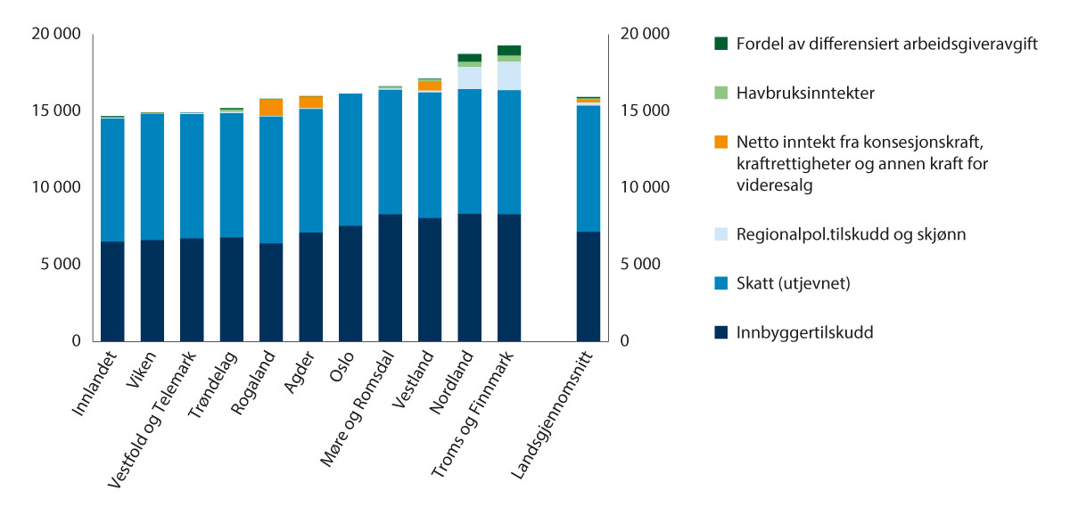 Figur 10.5 viser at Troms og Finnmark fylkeskommune har de høyeste korrigerte inntektene, noe som må ses i sammenheng med regionalpolitiske tilskudd, det vil si Nord-Norgetilskuddet, og fordel av differensiert arbeidsgiveravgift. Fylkeskommunene Innlandet, Viken og Vestfold og Telemark har de laveste korrigerte frie inntektene.