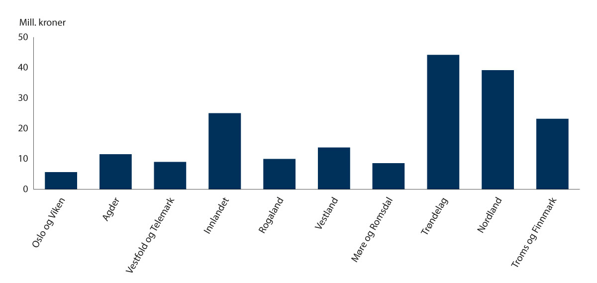 Figur 4.1 viser fordeling av prosjektskjønnsmidler per fylke. Trøndelag fordelte mest skjønnsmidler til fornyings- og innovasjonsprosjekter med om lag 44 mill. kroner til 32 prosjekter, tett fulgt av Nordland som fordelte om lag 39 mill. kroner til 51 prosjekter. Oslo og Viken fordelte om lag 6 mill. kroner til seks prosjekter, som er den laveste andelen.