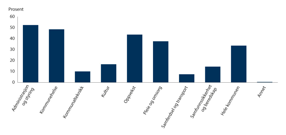 Figur 4.2 viser at 34 prosent av fornyings- og innovasjonsprosjektene omfatter hele kommunen. Fordelingen på sektorer viser at det er mange prosjekter innen administrasjon og styring, kommunehelse, oppvekst og pleie- og omsorg.