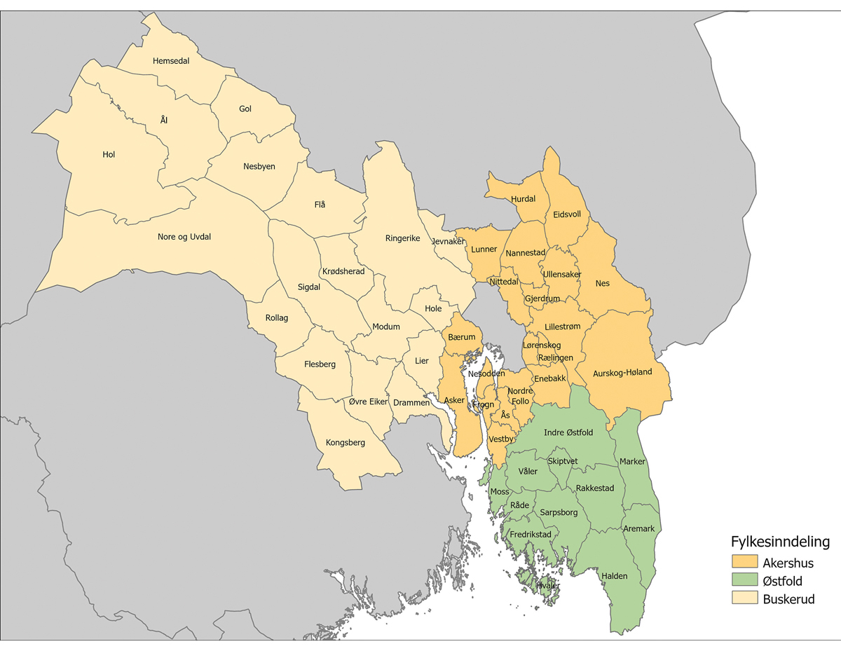 a. Akershus bestående av kommunene- Asker, Bærum, Nesodden, Frogn, Vestby, Nordre Follo, Ås, Enebakk, Aurskog-Høland, Lillestrøm, Rælingen, Lørenskog, Nes, Eidsvoll, Hurdal, Nannestad, Ullensaker, Nittedal, Gjerdrum og Lunner.