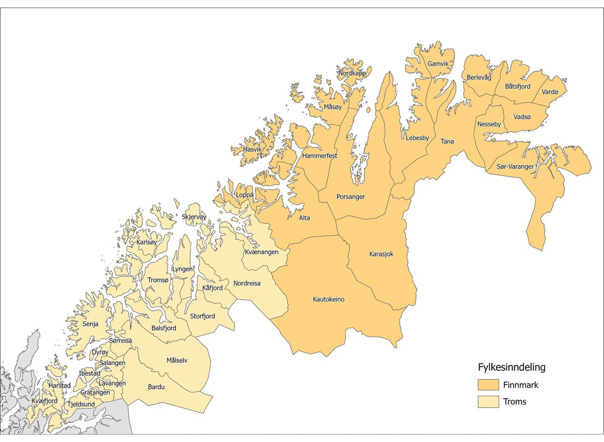 Finnmark fylke: Alta, Vardø, Vadsø, Hammerfest, Kautokeino, Loppa, Hasvik, Måsøy, Nordkapp, Porsanger, Karasjok, Lebesby, Gamvik, Berlevåg, Tana, Nesseby, Båtsfjord og Sør-Varanger kommuner.