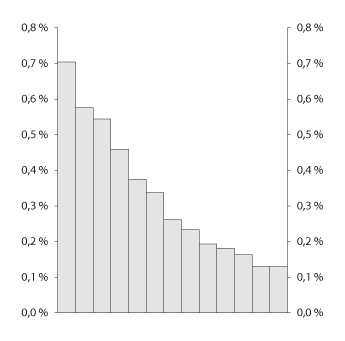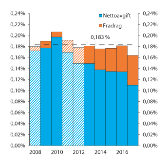 Figur 10.4 viser at beregnet årlig bruttoavgift til Bankenes sikringsfond har tilsvart om lag 1,8 promille av totale garanterte innskudd de senere årene. Den nedadgående utviklingen tilsier imidlertid at veksten i bankenes risikovektede eiendeler (beregningsgrunnlaget) har vært lavere enn veksten i garanterte innskudd, ettersom bruttoavgiften skal fastsettes til summen av 1 promille av bankens garanterte innskudd og 0,5 promille av bankens beregningsgrunnlag. Figuren viser for øvrig også at 0,5 promille av beregningsgrunnlaget i gjennomsnitt de senere årene har svart til om lag 0,8 promille av garanterte innskudd.