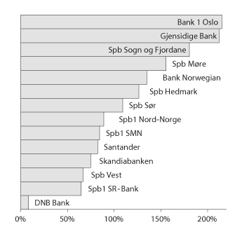 Figur 10.12 viser at utvalgte banker som i stor grad baserer sin virksomhet på forbrukslån, kan få betydelig økt bidragsplikt til det nye innskuddsgarantifondet sammenlignet med dagens sikringsfondsavgift. Figuren gjengir Bankenes sikringsfonds foreløpige beregninger av det nye årsbidraget, basert på data per 3. kvartal 2016, og forutsetninger i tråd med EBAs retningslinjer. Økningen i den samlede bidragsplikten for dette utvalget av banker anslås til i underkant av 80 pst. Bankenes sikringsfond har opplyst at risikofølsomheten i fordelingen av de nye bidragene kan økes ytterligere, bl.a. ved å videreutvikle indikatorsettet og generelt legge større vekt på risikojusteringselementet. Bidrag til krisetiltaksfondet kommer i tillegg.36