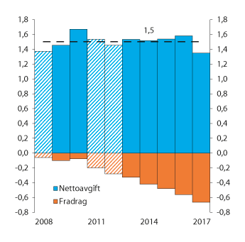 Den årlige avgiftsinnbetalingen fra medlemmene har ligget på om lag 1,5 mrd. kroner de senere årene, se figur 10.3. Årsaken til at samlet avgift har ligget på tilnærmet samme nominelle beløp over mange år, er at avgiftsfradraget for kjernekapitaldekning over 8 pst., jf. loven § 19-6 annet ledd, har økt i takt med at foretakene har styrket sin soliditet i tråd med nye kapitalkrav etter 2013. Minstekravet til kjernekapitaldekning er i dag 6 pst., og i tillegg kommer bufferkrav på minst 7 pst. (inkludert motsyklisk buffer). Norske bankkonsern hadde ved utgangen av 2016 en samlet kjernekapitaldekning på 17,5 pst., og dekningen er generelt noe høyere enn dette i bankene på foretaksnivå (som er det avgjørende for avgiften til Bankenes sikringsfond). Det maksimale avgiftsfradraget på 35 pst. av bruttoavgiften etter loven § 19-6 annet ledd, nås ved en kjernekapitaldekning på 16,75 pst., og de aller fleste norske banker ligger over dette nivået i dag. Avgiftsfradraget vil i 2017 utgjøre om lag 660 mill. kroner, samtidig som betalt avgift summert for alle medlemsbankene blir noe lavere enn i tidligere år pga. filialiseringen av Nordea Bank Norge.