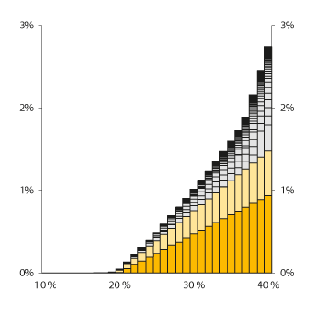 Departementet antar videre at risikobaserte bidrag i tråd med departementets lovforslag vil innebære vesentlig økt risikofølsomhet sammenlignet med dagens sikringsfondsavgift. Risikoelementet i sikringsfondsavgiften er i dag begrenset til at beregningsgrunnlaget for kapitalkrav inngår i avgiftsgrunnlaget. Det nye opplegget antas å kunne ha særlig kraftige virkninger for banker som driver med høy risiko, og som i hovedsak finansierer seg med innskudd. Departementet foreslår ingen øvre grense for hvor stor andel av samlede bidrag som skal betales av enkeltmedlemmer.