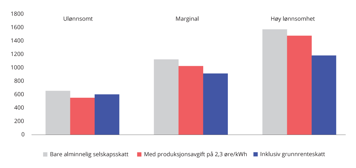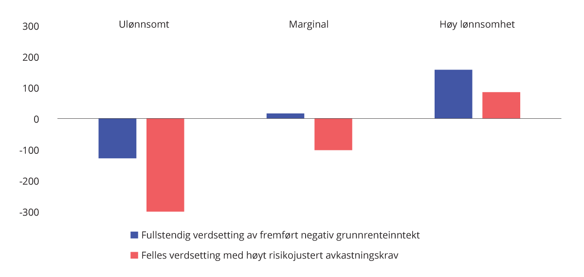 Dersom en ikke tar hensyn til at fremtidige skattefradrag i grunnrenteskatten er sikre, kan lønnsomheten av investeringen undervurderes vesentlig. Investeringer som er lønnsomme før grunnrenteskatt, ville da fremstå som ulønnsomme etter grunnrenteskatt. Dette kan illustreres for et nytt vindkraftanlegg med investering på 1 000 mill. kroner i tre tilfeller med ulik lønnsomhet, se figur 5.2. Investeringen er i utgangspunktet forutsatt marginalt lønnsom etter skatt med forslagene i denne proposisjonen. Investeringskostnaden er deretter økt og redusert med 25 pst. for henholdsvis å illustrere et ulønnsomt tilfelle og et tilfelle med høy lønnsomhet. I figuren illustreres nåverdiberegninger for fullstendig verdsetting av sikre, fremtidige skattefradrag i de blå søylene. De røde søylene illustrerer nåverdiberegninger ved grovere verdsetting, hvor et høyt risikojustert avkastningskrav benyttes for hele kontantstrømmen, som har både sikre og usikre deler. Figuren viser at sistnevnte metode vil undervurdere verdien av prosjektene etter skatt for alle tilfeller.