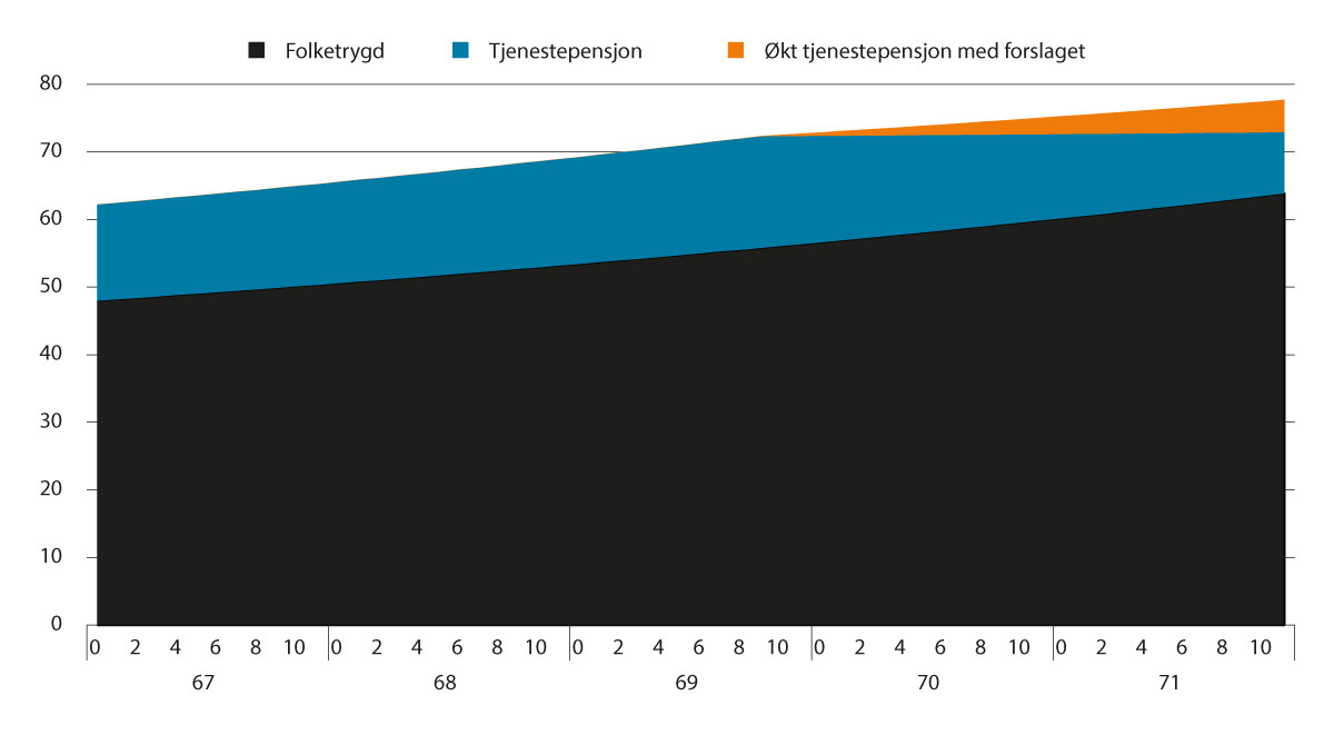 Forutsetninger: Det er forutsatt full opptjening av offentlig tjenestepensjon med en sluttlønn på 6 G. Det er videre forutsatt at alderspensjon fra folketrygden utgjør 54 prosent av sluttlønn, før levealdersjustering. Dette vil for eksempel være tilfellet for en enslig pensjonist med jevn inntekt på 6 G i 40 år. Videre er det forutsatt samordningsfordeler som utgjør 4 prosent av sluttlønn før levealdersjustering.