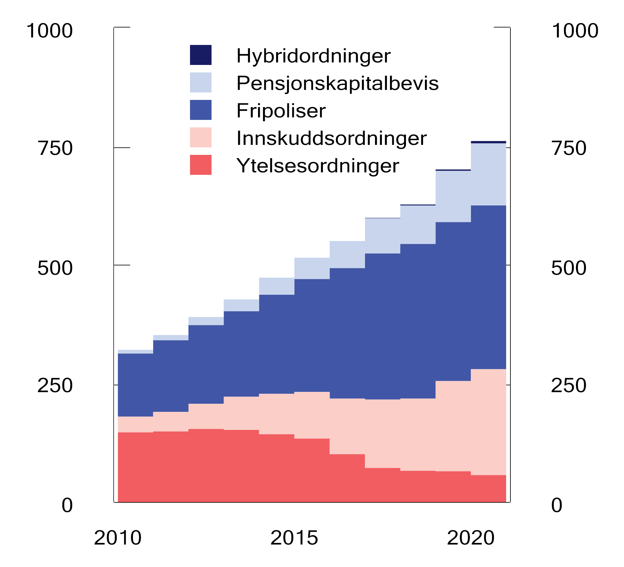 Figur 2.1 Forvaltningskapital i private tjenestepensjonsordninger. Mrd. kroner