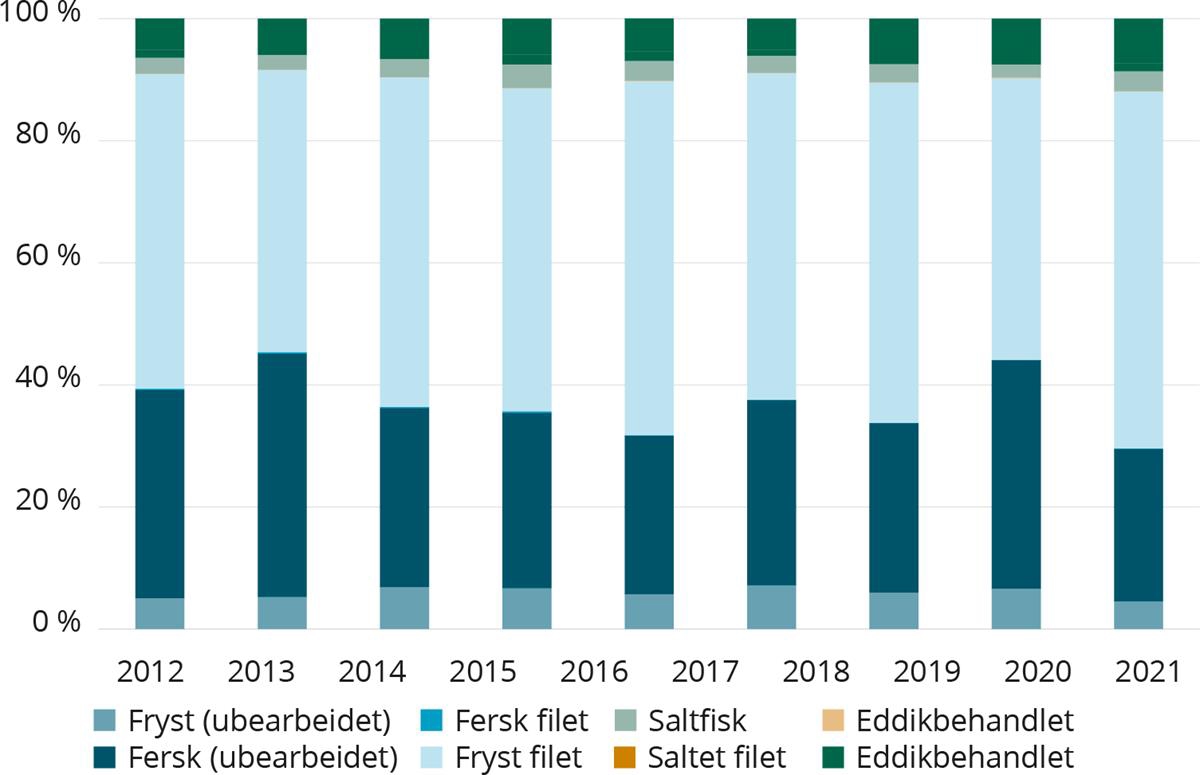 For torsk har andelen som eksporteres ubearbeidet økt fra rundt 30 prosent i 2012 til rundt 48 prosent i 2021. Filetandelen er marginal og er i dag på rundt 14 prosent. Klippfisk har vært den største produktkategorien innenfor bearbeidet torsk i hele perioden og har utgjort rundt 45 prosent av det bearbeidede kvantumet torsk de siste årene.