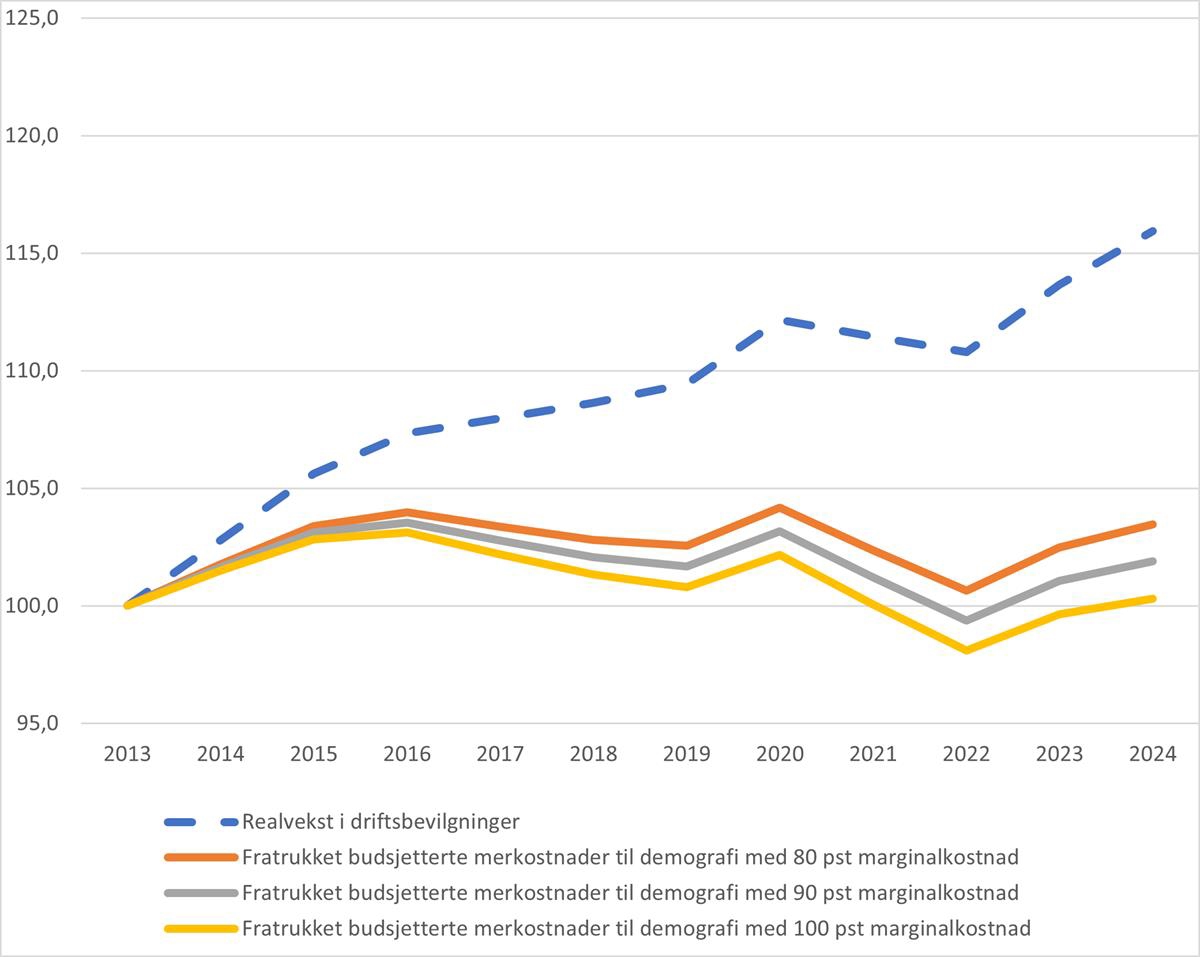 Realvekst i driftsbevilgninger, og fratrukket merkostnader til demografisk behov med en forutsetning om 80, 90 og 100 prosent marginalkostnad. 2013=100. Mrd. 2024-kroner. 2013 til 2024.