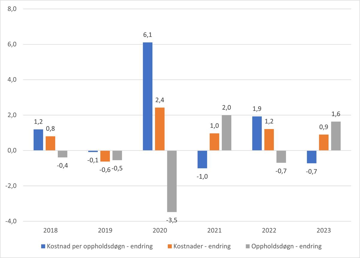 I figur 5.7 vises utviklingen i kostnad per vektet oppholdsdøgn dekomponert i aktivitets- og kostnadseffekt.