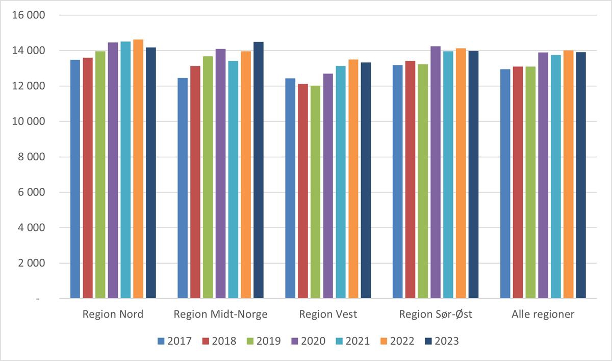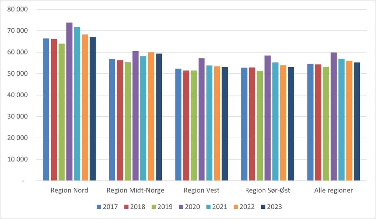 Utviklingen i kostnad per DRG-poeng i perioden 2017 til 2023 for de fire regionale helseforetakene framgår av figur 5.5. Det er regionale variasjoner i utviklingen. Alle regionene hadde et høyere kostnadsnivå i 2023 sammenlignet med 2017.
