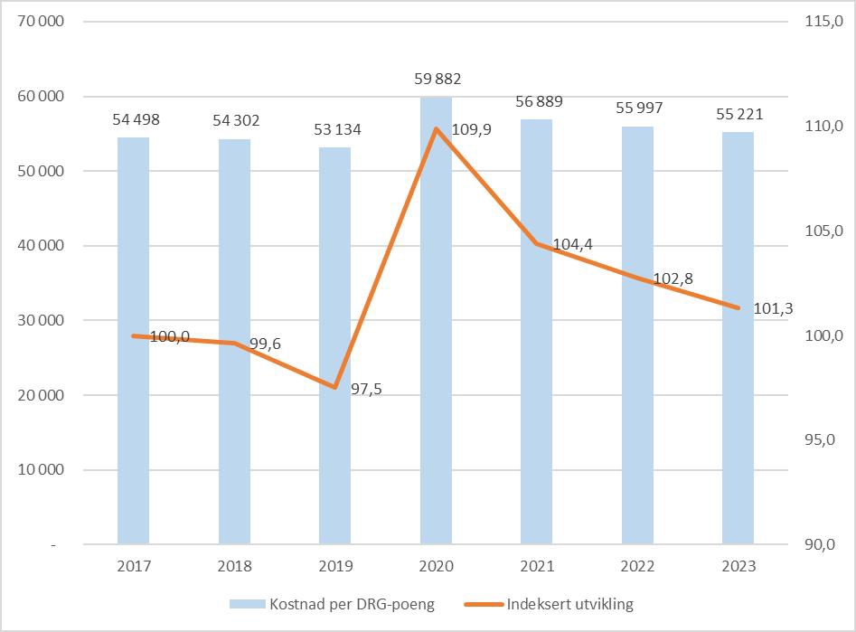 Fram til pandemien var det en reduksjon i kostnad per DRG-poeng. Effekten av pandemien illustreres tydelig med økningen fra 2019 til 2020. Etter 2020 har det vært en reduksjon i kostnad per DRG-poeng. I 2023 var kostnad per DRG-poeng 1,3 prosent høyere for landet samlet sammenlignet med 2017.