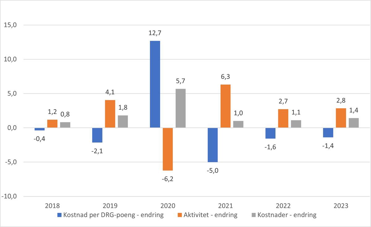 I figur 5.4 vises utviklingen i kostnad per DRG-poeng dekomponert i aktivitets- og kostnadseffekt. Med unntak av pandemiåret 2020, har aktivitetsveksten vært større enn kostnadsveksten. Det betyr at produktiviteten, målt som endring i kostnad per DRG-poeng, har økt alle år med unntak av pandemiåret 2020. Kostnadsnivået i 2023 var likevel over nivået i siste normalår før pandemien.