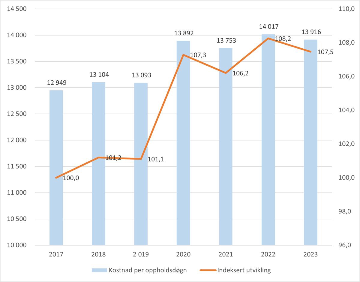 Figur 5.6 Kostnad per vektet oppholdsdøgn og utvikling i kostnad per vektet oppholdsdøgn for landet samlet. Psykisk helsevern og TSB. 2017 til 2023. 2017 = 100. Faste priser.