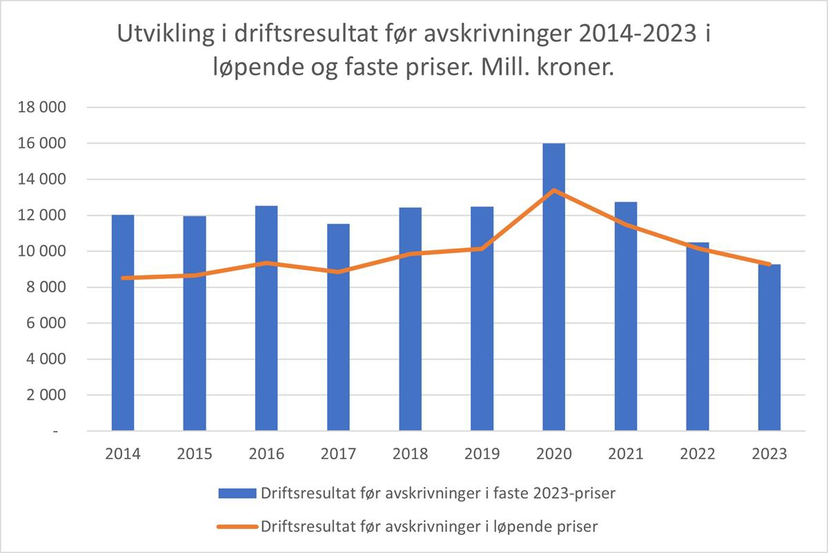 En bærekraftig utvikling tilsier at driftsresultat før renter og avskrivninger, som et minimum må øke med prisveksten på bygninger, teknologi og utstyr for å kunne gjenanskaffe kapitalen. Resultat før renter og avskrivninger er om lag uendret fra 2014 til 2021 for deretter å svekkes i 2022 og 2023 i faste priser. I perioden 2014 til 2023 har prisveksten på bygg vært om lag 41 prosent. Driftsresultat før avskrivninger i 2014 på 8,5 mrd. kroner tilsvarer derfor 12,0 mrd. kroner i 2023-kroner. Driftsresultat før renter og avskrivninger var samlet 9,3 mrd. kroner i 2023. Utviklingen i resultat før avskrivninger vil kunne påvirkes av en rekke forhold, herunder inntektsutviklingen etter kompensasjon for demografi, utviklingen i produktivitet og handlingsrommet til å kunne gjennomføre strukturelle endringer.