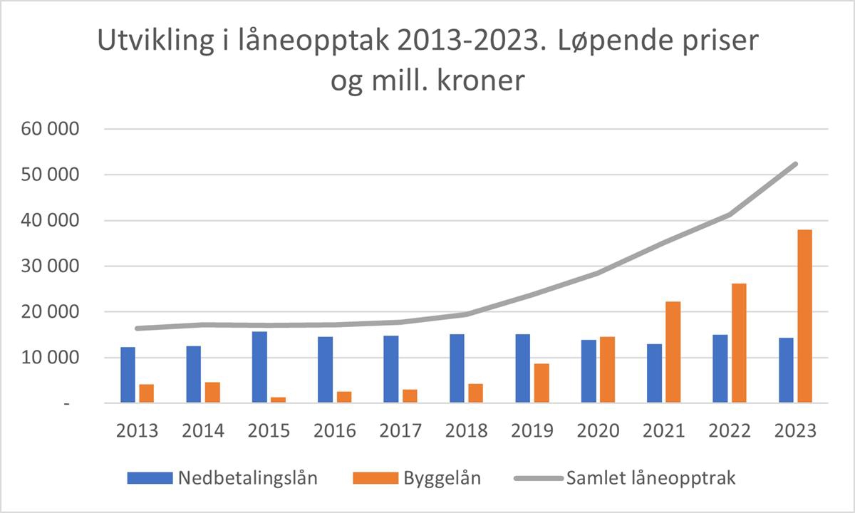 Figur 6.2 Utvikling i samlet låneopptak 2013–2023. Løpende priser og mill. kroner.