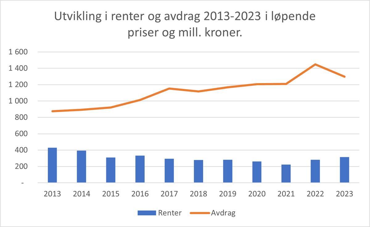 Figur 6.3 Utvikling i renter og avdrag 2013–2023. Løpende priser og mill. kroner. Kilde: Helse- og omsorgsdepartementet