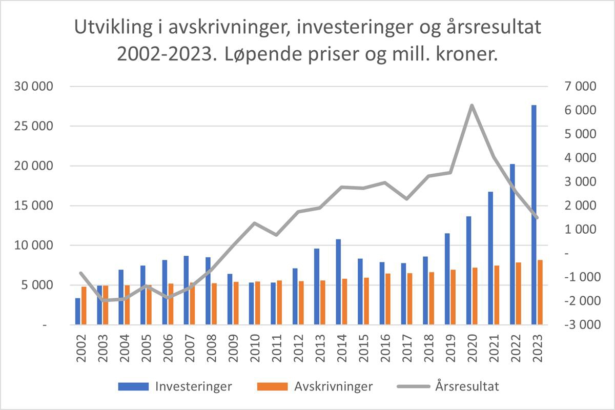 Figur 6.4 Utvikling i avskrivninger, investeringer og årsresultat i perioden 2002–2023. Løpende priser og mill. kroner.