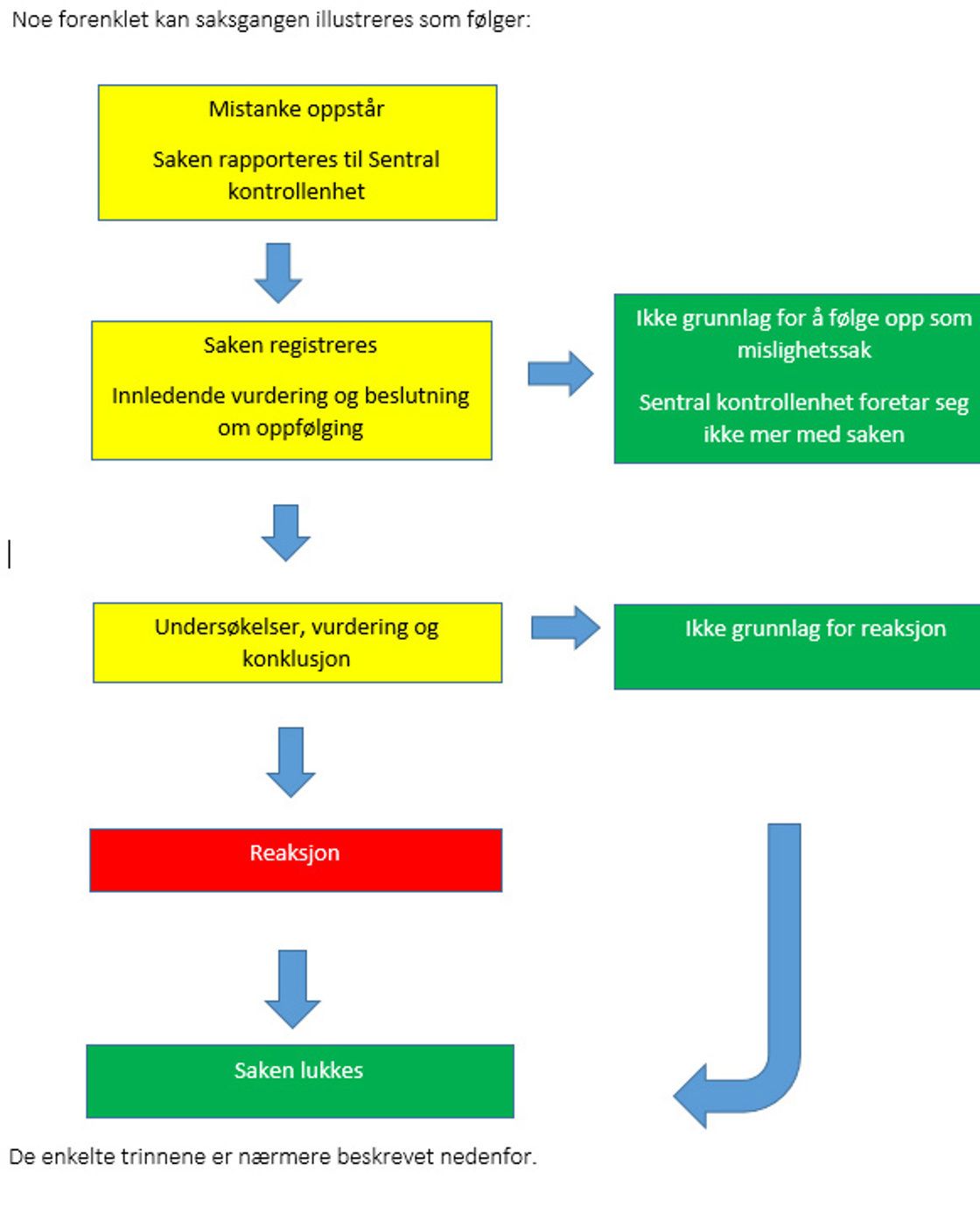 Sentral kontrollenhet vil deretter gjøre en første vurdering av saken og beslutte om det skal opprettes en varslingssak og hvordan den bør håndteres videre.