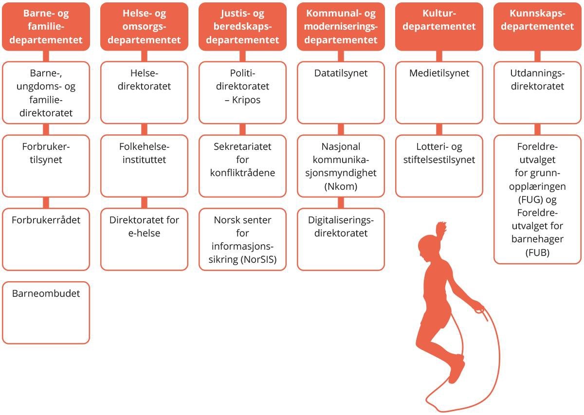 Oversikt over departementer, underliggende etater og virksomheter som deltar i arbeidet for trygg, digital oppvekst.