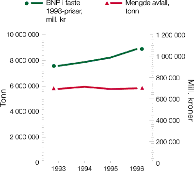 Figur 3.4 Utviklingen i avfallsmengder og BNP 1993–96. Avfallsmengder er nærings- og husholdningsavfall i tonn og BNP er i mill. faste 1998-kroner.