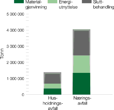 I figur 3.6 vises hvordan husholdningsavfall og næringsavfall er fordelt på de ulike disponeringsformene materialgjenvinning, energiutnyttelse og sluttbehandling. Mengden avfall som energiutnyttes er beregnet ut fra en gjennomsnittlig energiutnyttelse på 75 % ved de fem store kommunale avfallsforbrenningsanleggene og 100 % energiutnyttelse ved industrielle energianlegg. Med energiutnyttelse menes andel produsert energi som utnyttes. Med sluttbehandling menes deponering og forbrenning uten energiutnyttelse. Ved forbrenning med 75 % energiutnyttelse betyr det at 25 % av avfallsmengden blir regnet som sluttbehandlet.