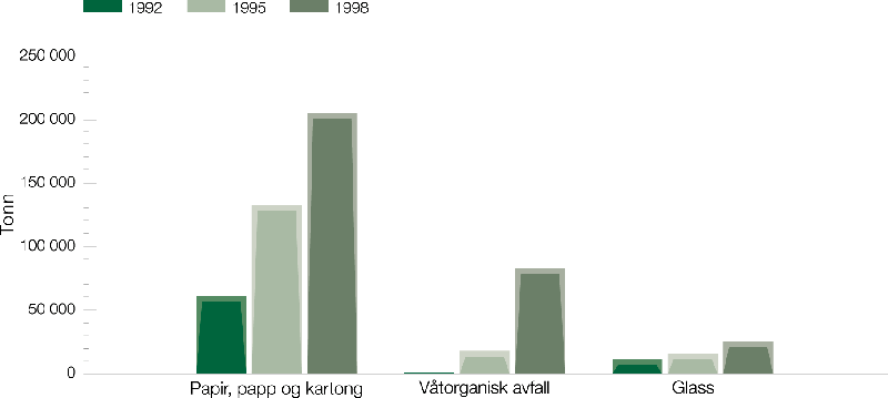 I figur 3.8 vises utviklingen i gjenvinningen for noen utvalgte avfallstyper fra 1992 til 1998. Mengden papir, papp og kartong fra husholdningene til materialgjenvinning har økt fra om lag 60 000 tonn i 1992 til om lag 200 000 i 1998. I samme tidsperiode har materialgjenvinning av våtorganisk avfall fra husholdningene økt fra drøye 1 000 tonn til i overkant av 80 000 tonn. Glassgjenvinningen har i samme tidsrom økt fra om lag 11 000 tonn til om lag 25 000 tonn.