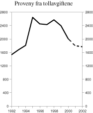 Figur 4.1 viser utviklingen i tollavgiftsprovenyet fra 1992 til 2002. Som følge av omleggingen av importvernet for landbruksvarer i 1995, som bl.a. innebar at prisutjevningsavgifter ble omgjort til toll, økte tollinntektene kraftig fra 1994 til 1995. Med unntak av 1998 har tollinntektene falt siden 1995. Dette skyldes tollreduksjoner på industrivarer dels som følge av WTO-avtaler og dels som følge av at norske myndigheter på eget initiativ har redusert tollsatsene siden 1995. Tollavgiftene ga 2 015 mill. kroner i inntekter i 2000. Tollavgiftsinntektene forventes å falle til om lag 1 800 mill. kroner i 2001. Tollavgiftene antas å falle til i overkant av 1 750 mill. kroner i 2002, som følge av forslaget om tollreduksjoner på industrivarer og som følge av tollreduksjonene i henhold til WTO-avtalen. Anslagene for tollinntektene er imidlertid usikre, og avhenger bl.a. av faktorer som norske kornavlinger og prisutviklingen på korn internasjonalt. Omleggingen av tollvernet på korn fra 1. juli 2001 vil bidra til å redusere tollinntektene fra denne varegruppen.