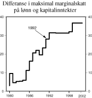 Figur 1.1 Differanse i maksimal marginalskatt på lønn1 og kapitalinntekter for personer 1980-2002. Prosentpoeng