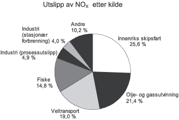 En rekke sektorer bidrar til utslipp av NOx. Sjøfart og fiske sto i 2004 for om lag 40 pst. av de samlede utslippene, mens olje- og gassvirksomheten sto for 21 pst., veitrafikken sto for om lag 19 pst. og industrien 9 pst., jf. figur 3.20.