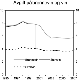 Avgiften på alkoholfrie drikkevarer ble lagt om fra 1. januar 2007, se omtale i St.prp. nr. 1 (2006-2007) Skatte-, avgifts- og tollvedtak. Dagens avgift omfatter drikkevarer som er tilsatt sukker eller søtstoff. Det innebærer at brus, lettbrus, nektar, saft, melkeprodukter mv. avgiftslegges dersom drikkevarene er tilsatt sukker. Drikkevarer som naturlig inneholder sukker, for eksempel presset fruktjuice, avgiftslegges ikke. Varene avgiftslegges med en avgift pr. liter salgsvare, og satsen er 1,64 kroner for 2007. Sirup tilsatt sukker eller søtstoff til ervervsmessig framstilling av alkoholfrie drikkevarer i dispensere mv. omfattes også av avgiften. Melkeprodukter som kun er tilsatt en mindre mengde sukker (til og med 15 gram sukker pr. liter), og varer i pulverform er fritatt fra avgiften.