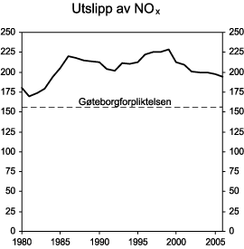 Norge er i henhold til Gøteborgprotokollen av 1999 forpliktet til å redusere de årlige utslippene av NOX til maksimalt 156 000 tonn innen 2010. Foreløpige utslippstall for 2006 viser at utslippene av NOX er redusert til 194 500 tonn, jf. figur 3.20. Det er forventet en reduksjon i utslippene av NOX i de kommende årene. Dette må ses i sammenheng med stadig strengere avgasskrav til kjøretøy og en økende andel kjøretøy med katalysator. Også utslipp fra olje- og gassvirksomheten ventes å avta som følge av lavere aktivitet. I tillegg vil avgiften på utslipp av NOX bidra til en ytterligere utslippsreduksjon. Det ble i St.prp. nr. 1 (2006-2007) Skatte-, avgifts- og tollvedtak anslått at en avgift på 15 kroner pr. kg NOX over tid kunne utløse utslippsreduksjoner på opp mot 25 000 tonn.