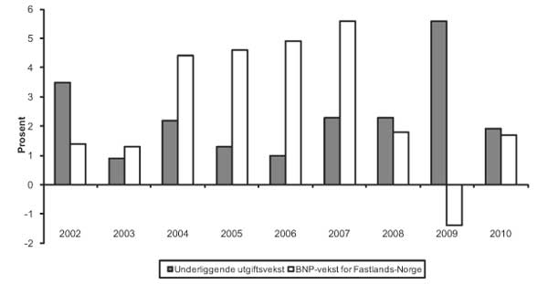 Figur 8.1 viser BNP-veksten for Fastlands-Norge og statsbudsjettets reelle, underliggende utgiftsvekst i perioden 2002-2010. Som det går fram av figuren, var BNP-veksten for Fastlands-Norge særlig sterk i årene fra 2004 til 2007, med en gjennomsnittlig vekst i underkant av 5 pst. per år. I denne perioden var den reelle veksten i statsbudsjettets utgifter vesentlig lavere enn veksten i BNP for Fastlands-Norge. I årene 2002 og 2003 var det svak vekst i fastlandsøkonomien, og i denne perioden vokste utgiftene på statsbudsjettet sterkere enn BNP for Fastlands-Norge. Som følge av finanskrisen og det markerte tilbakeslaget i norsk og internasjonal økonomi, har veksten i Fastlands-Norge snudd fra om lag 5,6 pst. i 2007 til om lag 1,8 pst. i 2008, og et fall i BNP for Fastlands-Norge på om lag 1,4 pst. i 2009. Etter det kraftige konjunkturomslaget i 2008 ble det iverksatt en rekke tiltak for å dempe tilbakeslaget i økonomien og for å stimulere sysselsettingen. Den reelle, underliggende veksten i statsbudsjettets utgifter fra 2008 til 2009 var på hele 5,6 pst. For 2010 anslås nå den reelle underliggende utgiftsveksten til 1,9 pst., mens veksten i BNP for Fastlands-Norge tar seg opp igjen fra 2009 og anslås til 1,7 pst.