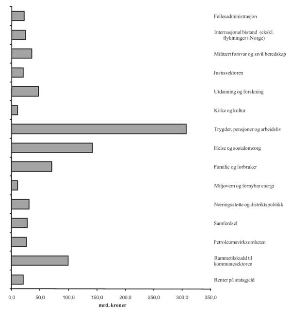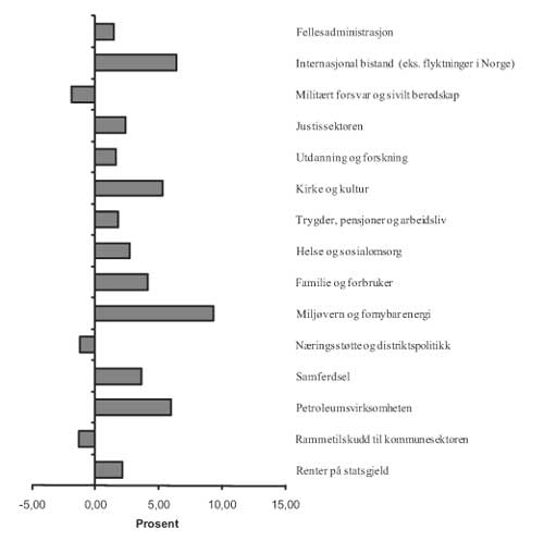 Tallene ovenfor viser at det i perioden 2002-2006 var en særlig sterk vekst i utgiftene til internasjonal bistand, kirke- og kulturformål og til tiltak innenfor familie- og forbrukerpolitikken. Utgiftene til militært forvar og sivil beredskap, miljøvern og fornybar energi og næringsstøtte og distriktspolitikk ble redusert.