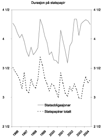 Durasjon blir ofte nytta som eit kvantitativt mål på renterisiko, der ein i tillegg til rentebinding tar omsyn til mellom anna betalingar av renter og avdrag fram til forfall. Durasjon gir meir informasjon om korleis marknadsverdien av gjelda blir påverka ved endringar i marknadsrentene enn det rentebinding gjer. Omgrepet blir nærare forklart i boks 3.1. For staten som budsjetterer og fører rekneskap etter kontantprinsippet og normalt ikkje fokuserer på endringar i marknadsverdiar, kan det være like hensiktsmessig å bruke det enklare omgrepet rentebinding som mål på renteeksponeringa.
