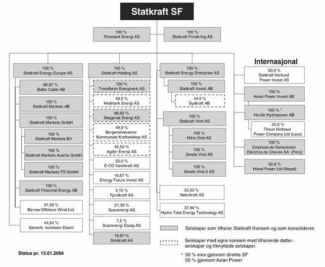 Dagens organisering er blant annet et resultat av at Statkraft siden omdannelsen til SF i 1992 har kjøpt andeler i flere andre kraftselskap i Norge, aksjeposter i det svenske kraftselskapet Sydkraft og det danske selskapet Scanenergi, samt at man har engasjert seg i vannkraftutbygging i Asia og Latin-Amerika. Se figur 2.1.